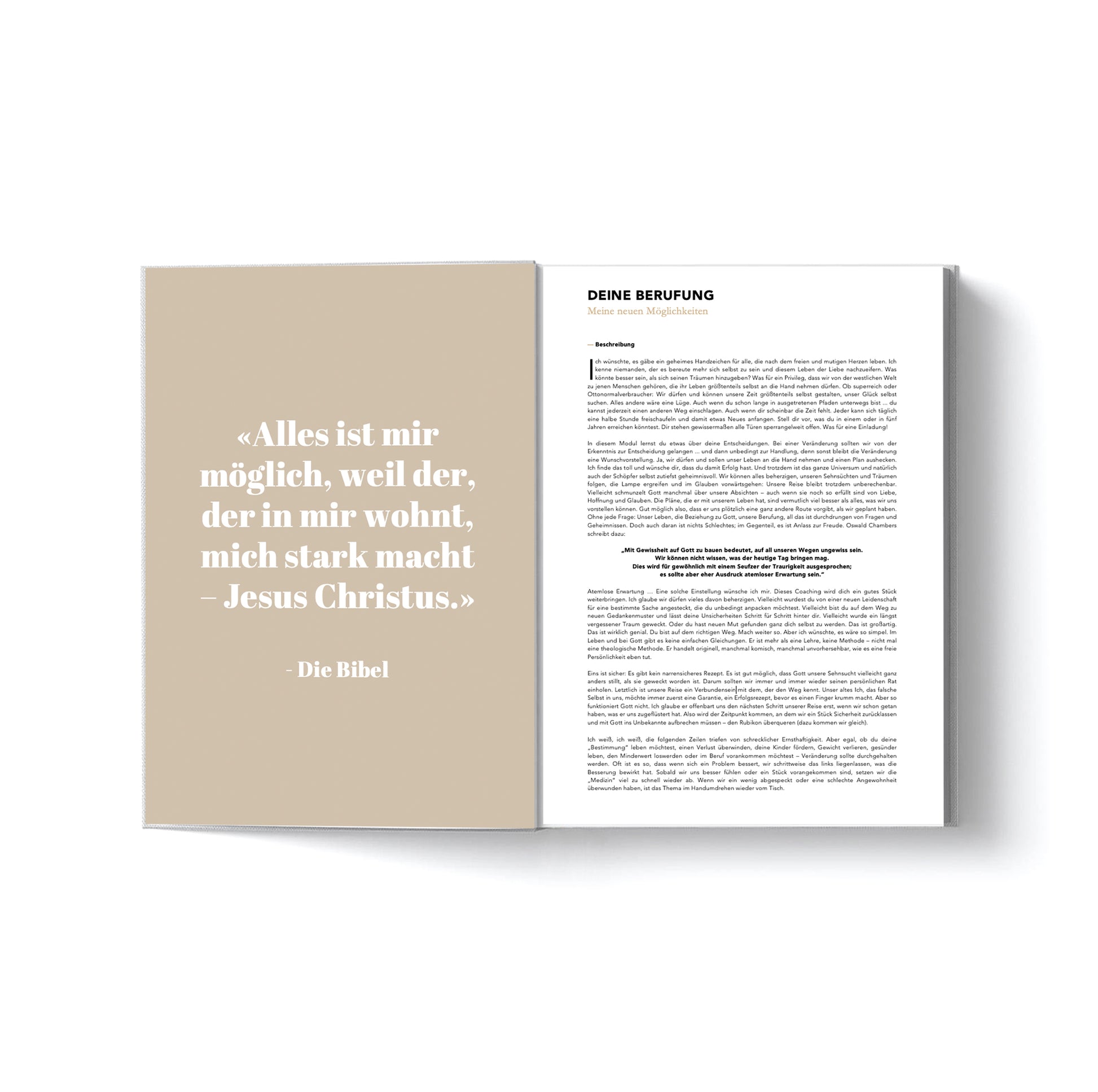 Neben einer Aufklärung zum Lebensstil, einer persönlichen Standortbestimmung und deiner Bedürfnisklärung findest du in diesem Buch viele Coaching-Methoden wie die TA-Analyse, den Lebensbaum, das Coaching-Dreieck, Skalenarbeit oder das bekannte ZRM® (Zürcher Ressourcen Modell) von Dr. Maja Storch. Diese Tools – kombiniert mit geistlichen und psychologischen Inputs – bringen dich deinen Zielen wirklich näher. Das Buch ist gespickt mit wissenschaftlichen und biblischen Inputs sowie vielen Coaching-Fragen, die dich Schritt für Schritt durch die Module bis zum Übergang ins Neue begleiten.